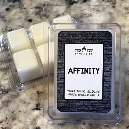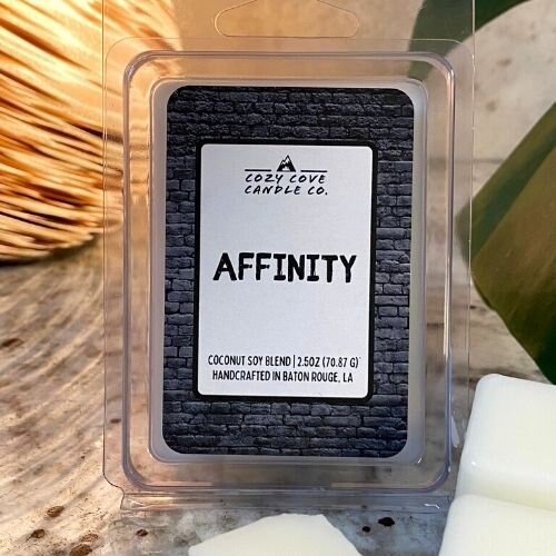Affinity boasts a refreshing masculine blend of petitgrain, cardamom and citrus, infused with jasmine and rosemary with a base of musk, oakmoss and brazilian rosewood. These wax melts will have your whole house smelling like date night!