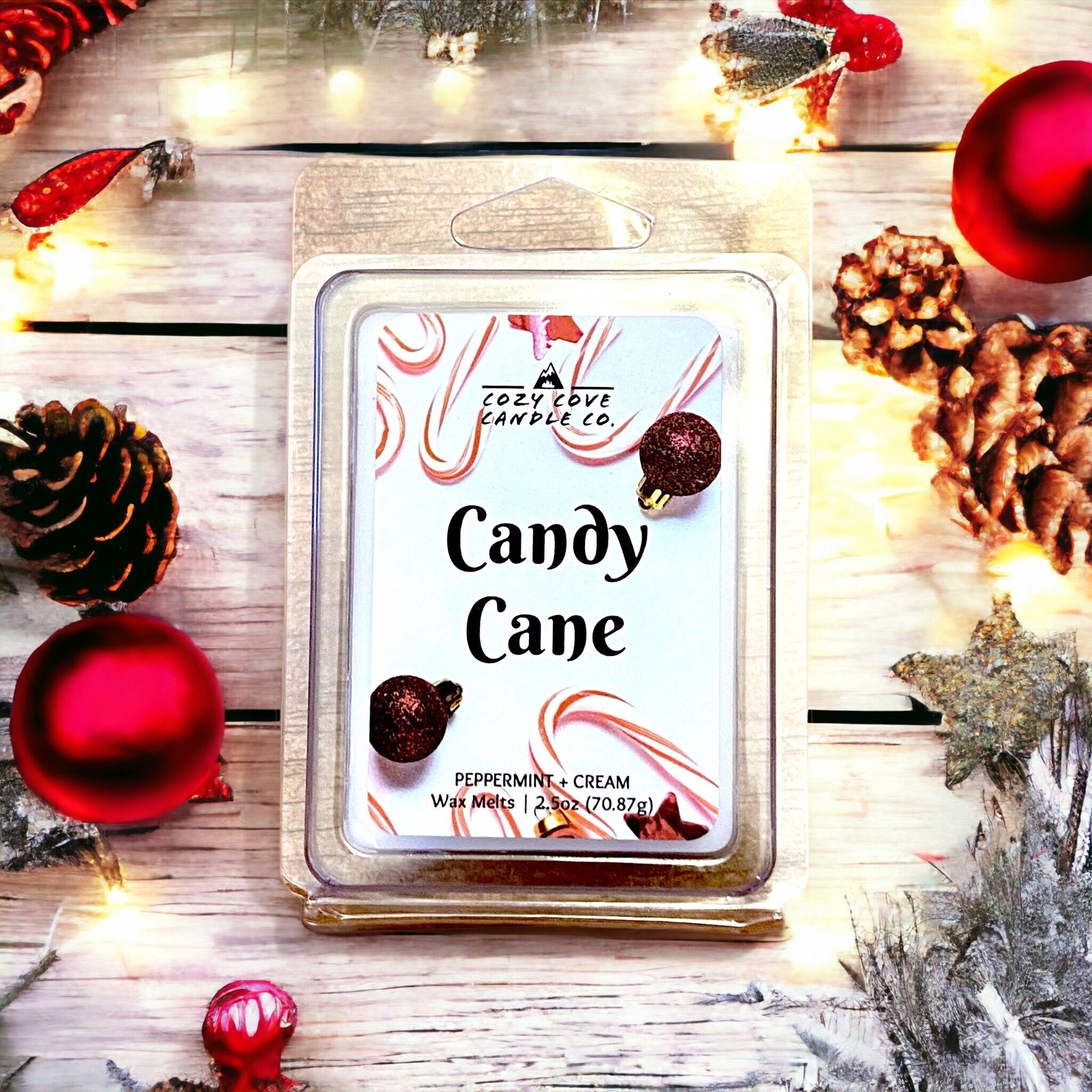 Experience the refreshing essence of the holidays with our Candy Cane wax melts. Cool, minty top notes lead to a revitalizing mint heart, while a comforting hint of vanilla completes the aroma. Transform your space into a crisp, minty-fresh haven with these delightful wax melts.